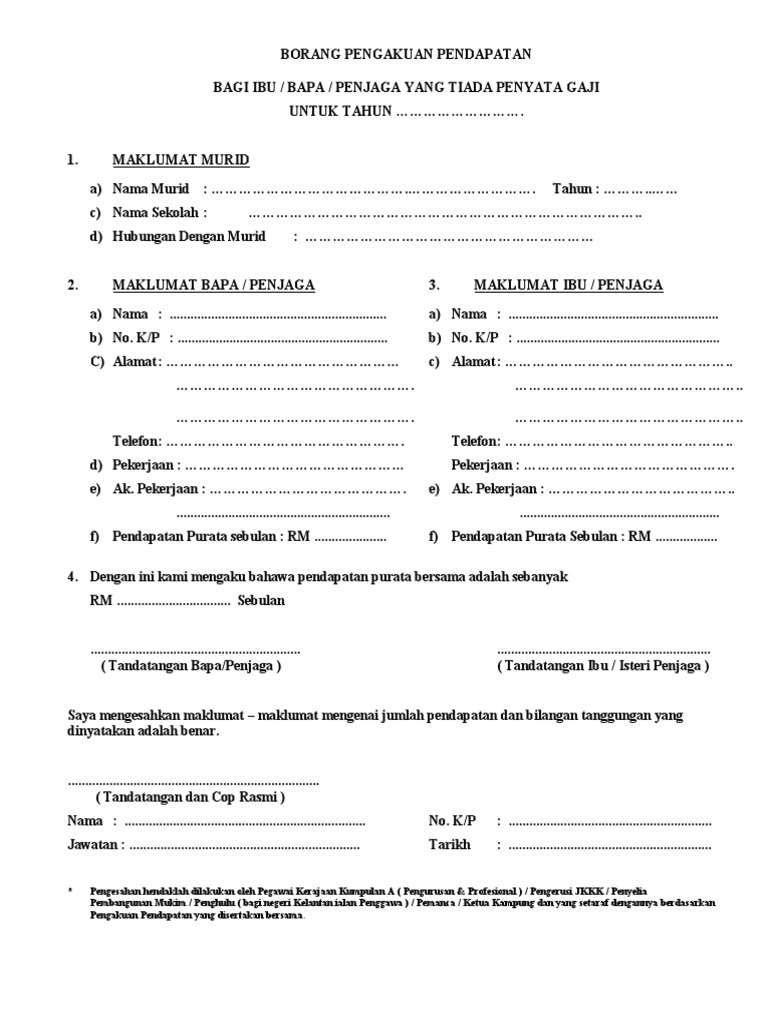 Permohonan Pinjaman Pelajaran Dalam Negara Yayasan ... from portal.ypj.gov.my (pemohon dan pasangan yang tidak mempunyai slip gaji / penyata pendapatan). Yayasan perak, tingkat 1, wisma yayasan perak, no.111, jalan sultan idris shah, 30000 ipoh, perak. Diperolehnya aset lain sebagai pengesahan terhadap transaksi penjualan tersebut. * pengesahan hendaklah dibuat oleh pegawai kerajaan kumpulan a (pengurusan dan professional)/pengerusi jkkk/penyelia pembangunan mukim/penghulu/ketua kampung dan yang. Surat akuan pengesahan pendapatan ini adalah sebagai pengesahan pendapatan pemohon daripada daripada orang tertentu. Metode perhitungan pendapatan nasional terbagai menjadi tiga yaitu metode pendekatan dihitung pada periode ekonomi tertentu yang biasanya berlangsung selama satu tahun. Permendagri nomor 38 tahun 2018 tentang pedoman penyusunan anggaran pendapatan dan belanja daerah tahun anggaran 2019. Tarikh akhir pengemukaan borang be tahun taksiran 2017 adalah 30 april 2018.